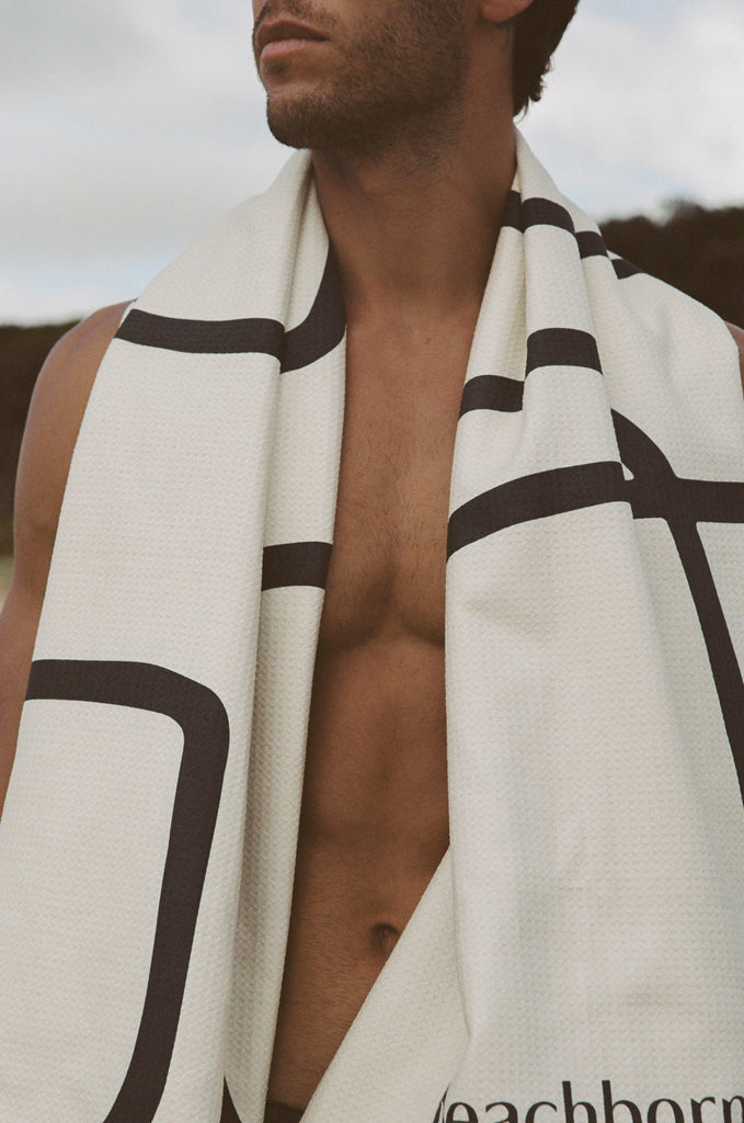 The Beachborne beach towel is sand free, super absorbent, quick dry, compact and lightweight. Perfect for your local beach days and overseas travel. Consciously crafted with our premium high performance GRS-certified recycled fabric. Designed in Australia to be beautiful, functional, eco friendly, and to reduce unnecessary manufacturing, water and packaging waste.