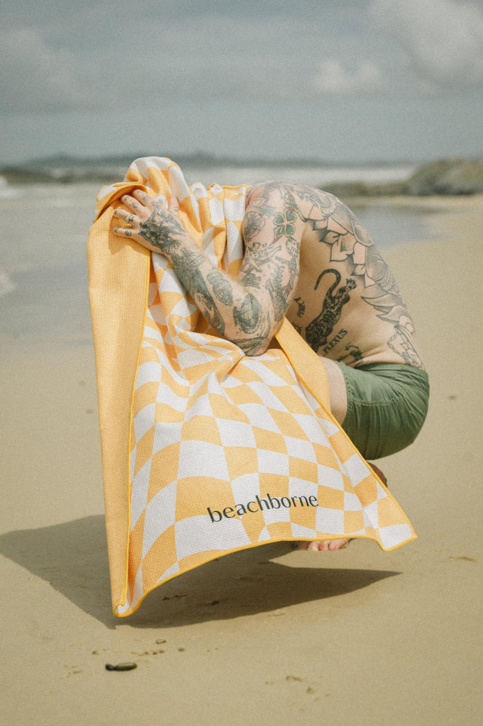 The Beachborne beach towel is sand free, super absorbent, quick dry, compact and lightweight. Perfect for your local beach days and overseas travel. Consciously crafted with our premium high performance GRS-certified recycled fabric. Designed in Australia to be beautiful, functional, eco friendly, and to reduce unnecessary manufacturing, water and packaging waste.